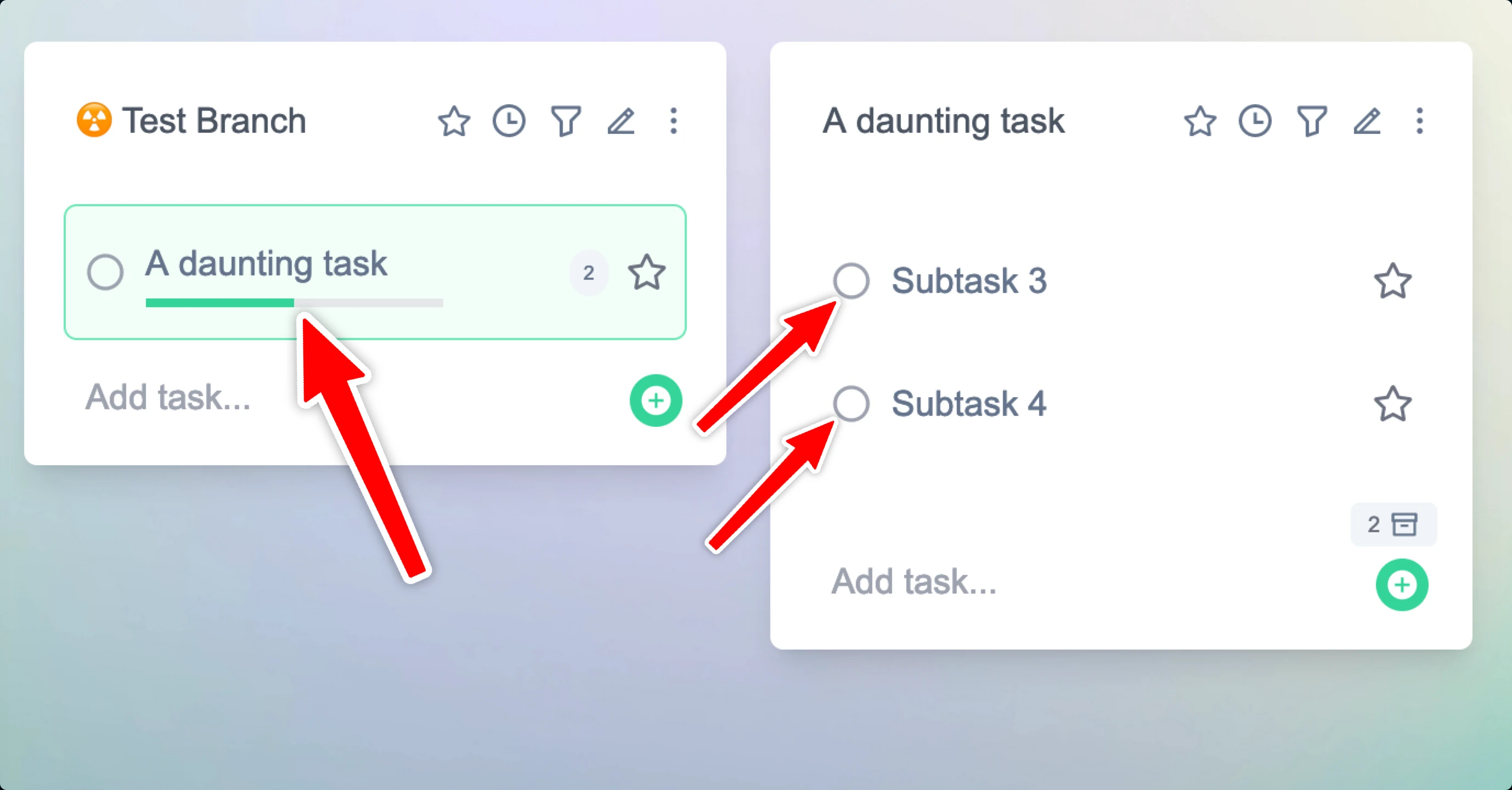Once you've completed a task it's incredibly satisfying to archive it and see it disappear. In Tatask this will also show how much progress you've made on the parent task. You'll quickly find how motivating it is to see the progress bar fill up as you complete tasks.