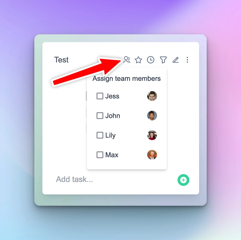 You can assign a team member to a task or branch by clicking on the assignee icon in the task menu.