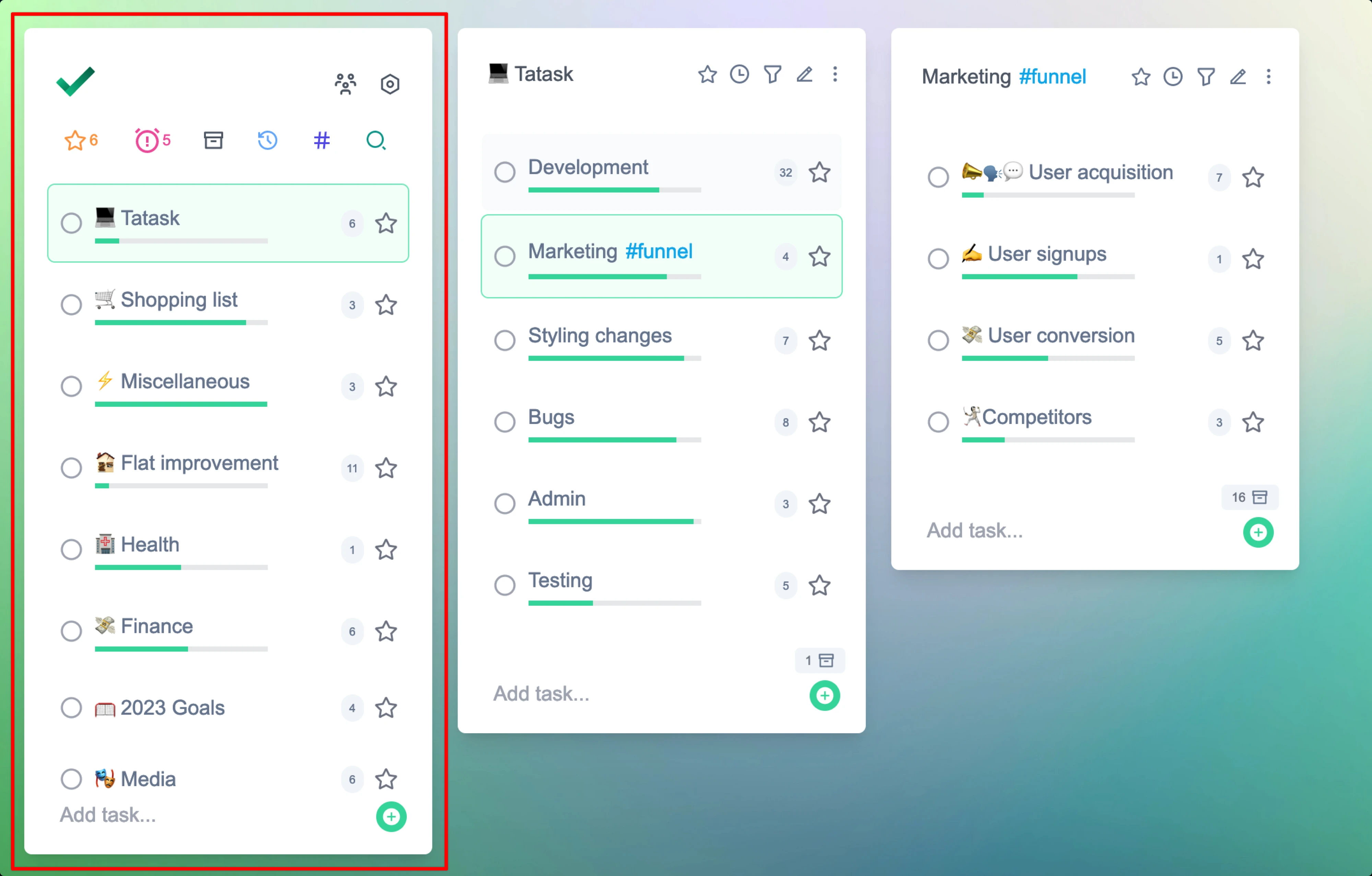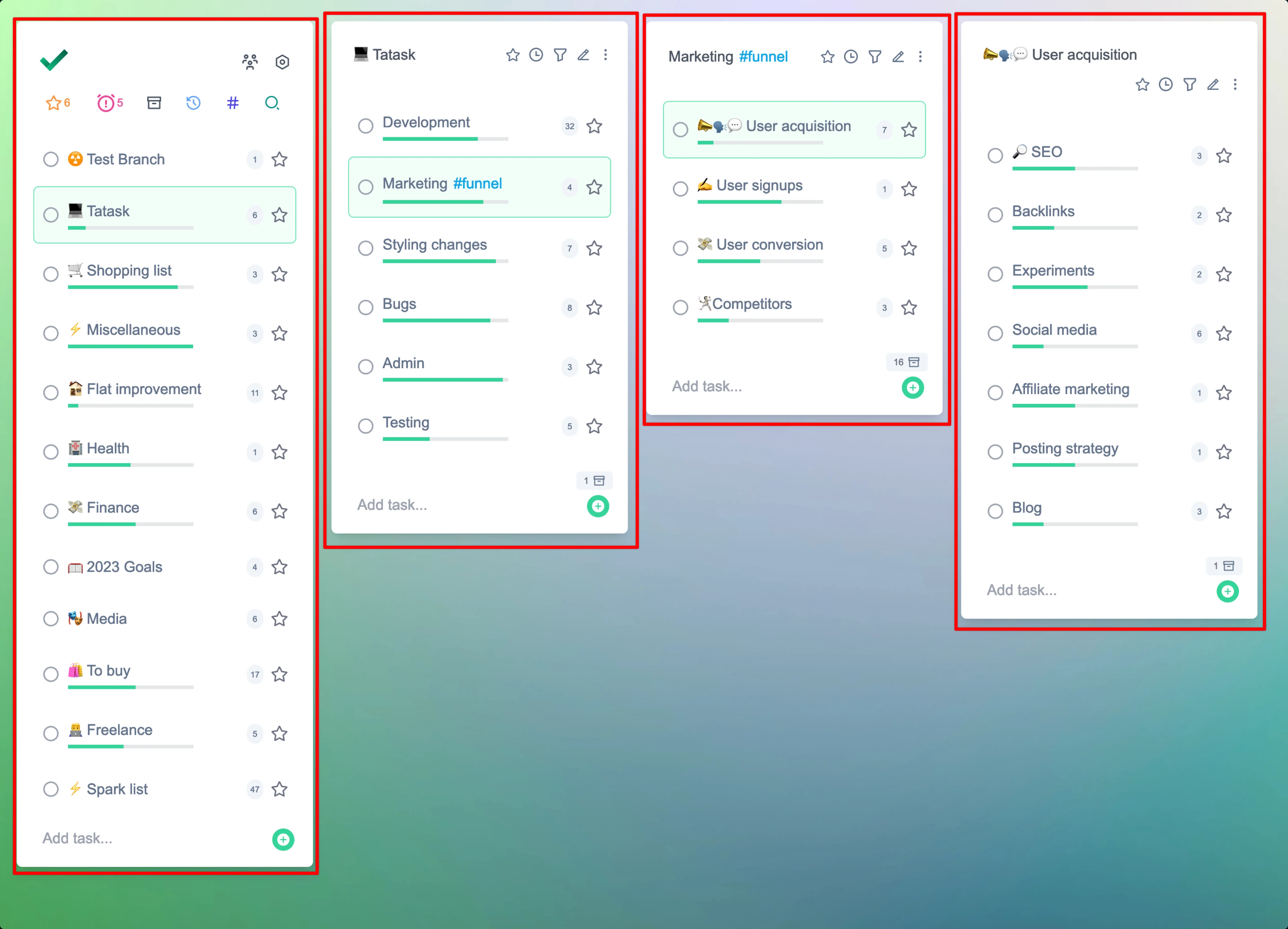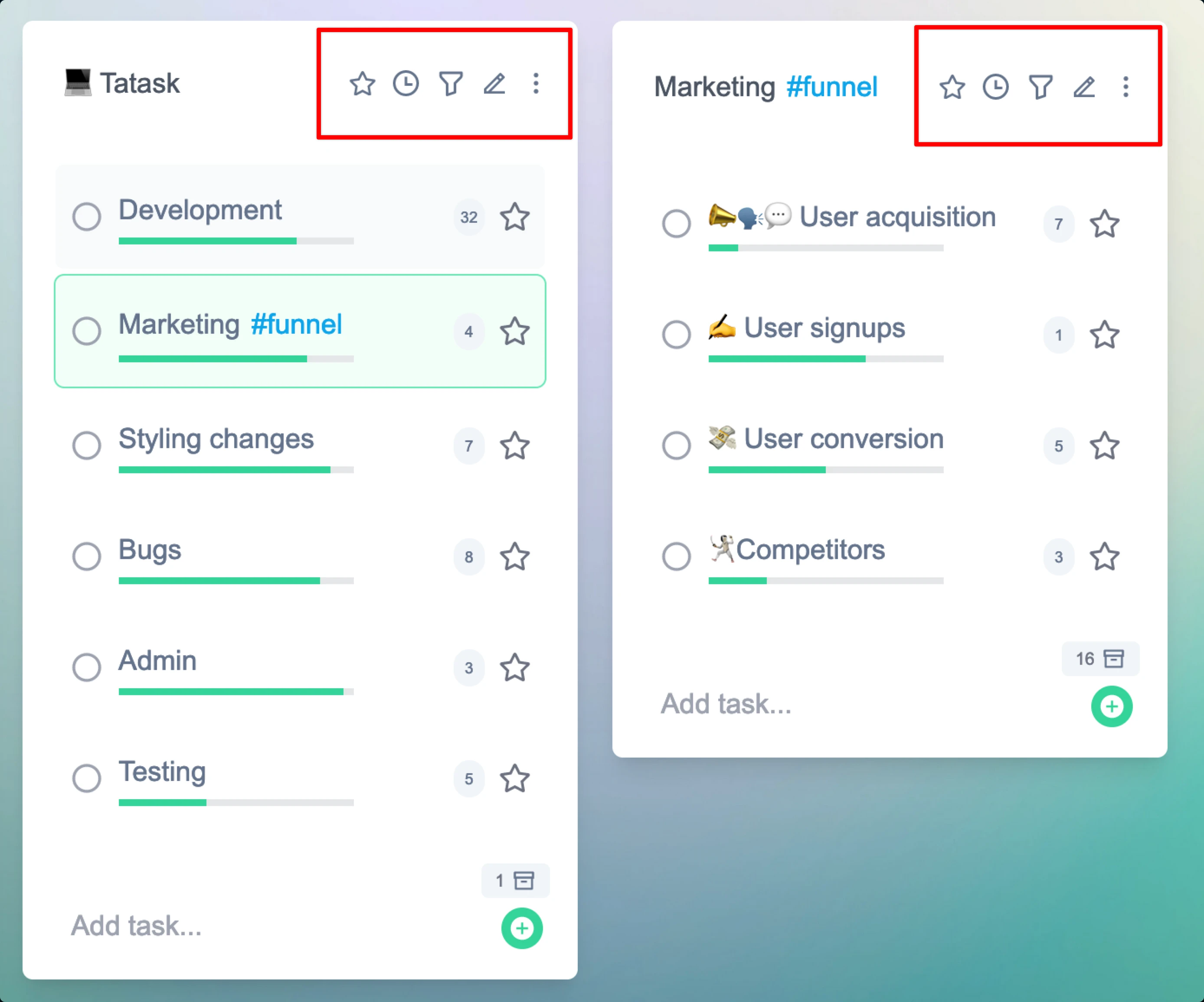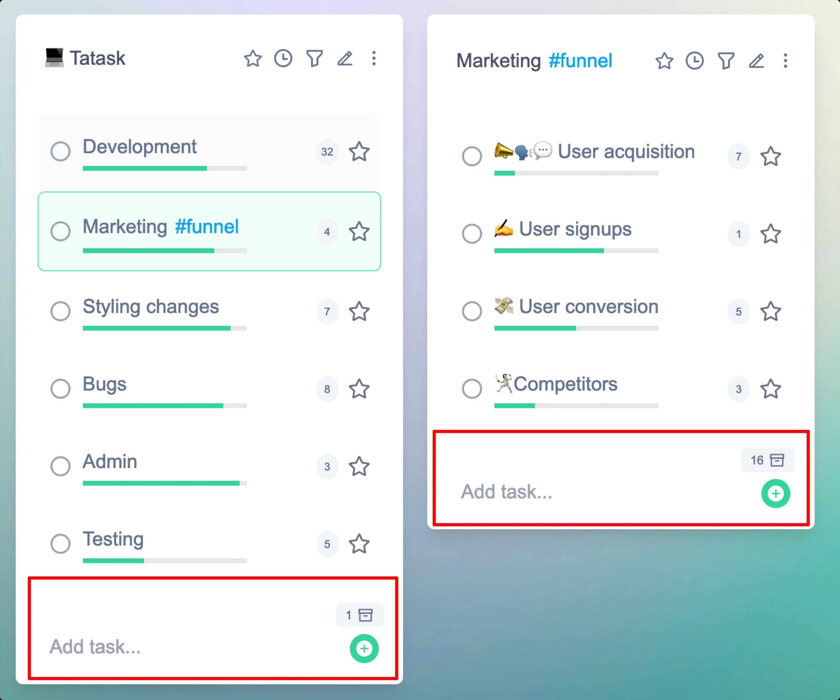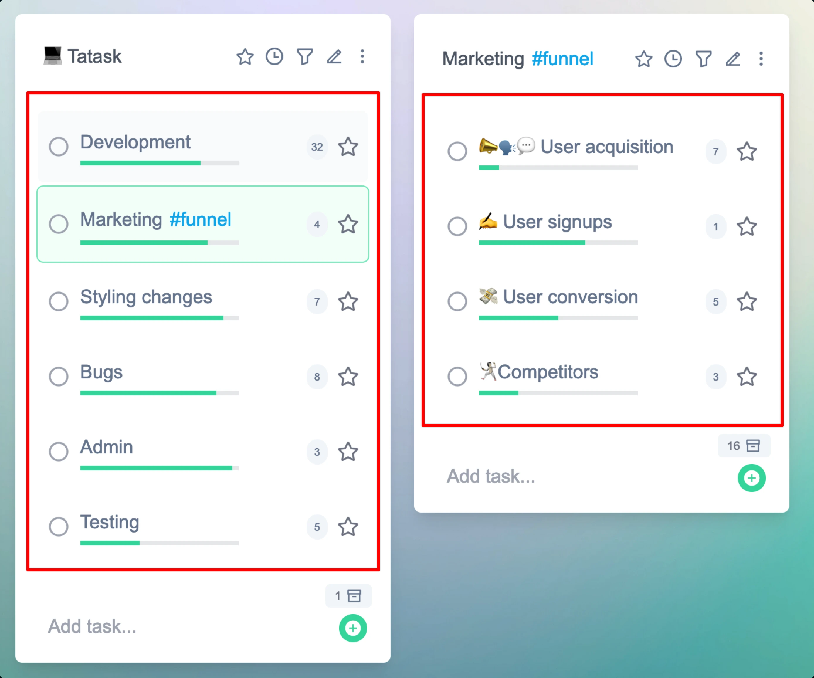 Task cards are what everything in tatask is based around. They are a container for all your tasks. Each of the red outlines below shows a card