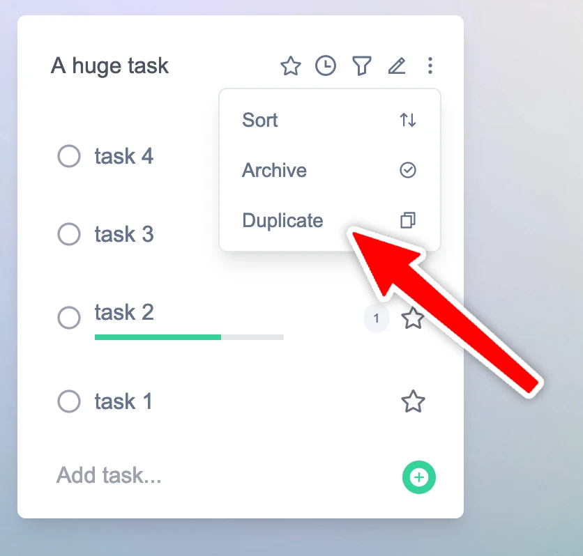 Sometimes it's useful to duplicate a task for workflows that you might repeat with minor changes each time. Tatask makes this really simple. To duplicate a task, click on the task card menu and press duplicate. This will make an exact copy of the task and all its subtasks.
