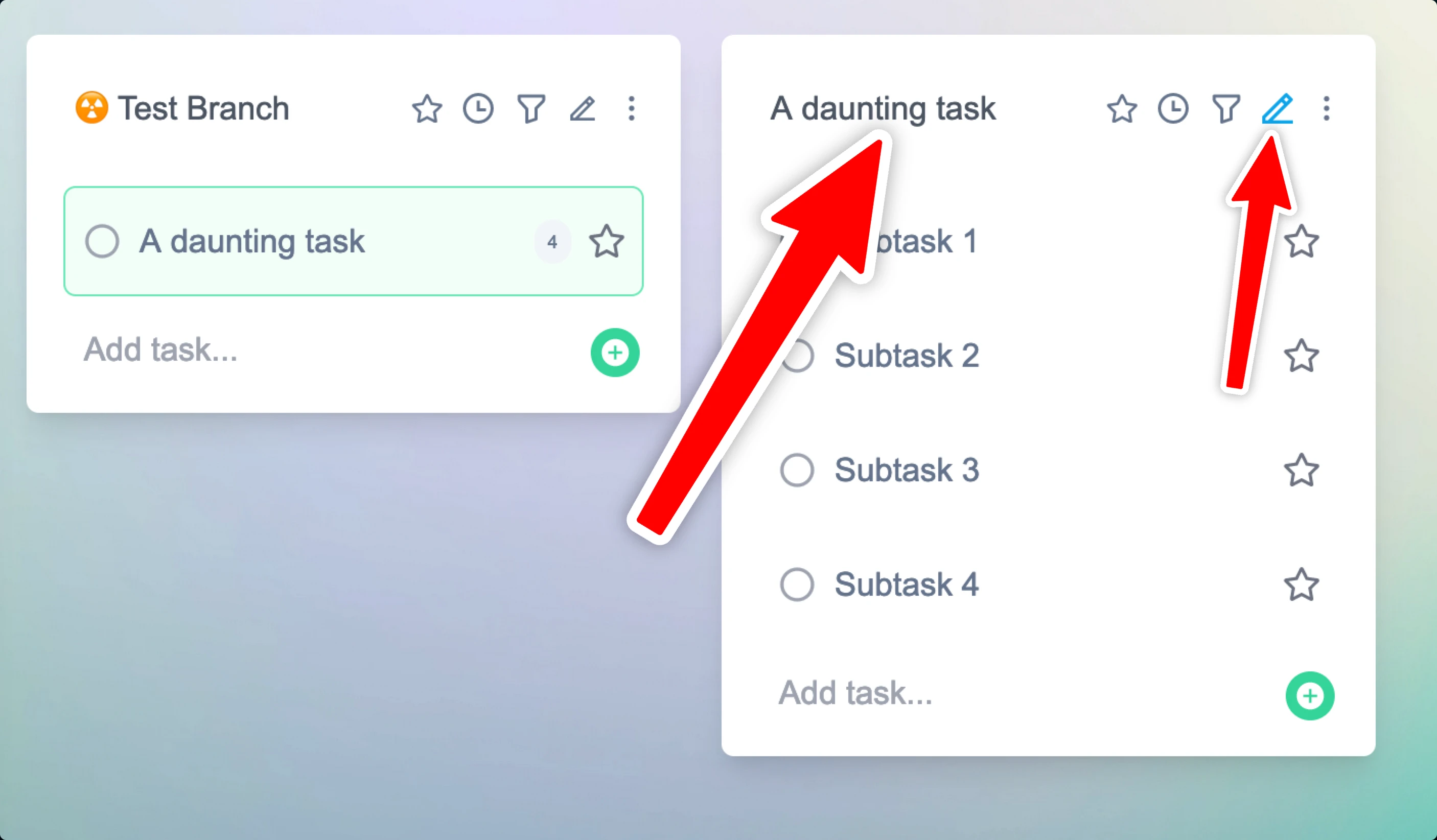 To edit a task, simply click on the pen button on the top right of a task. Alternatively you can double click on the task description to start editing immediately.