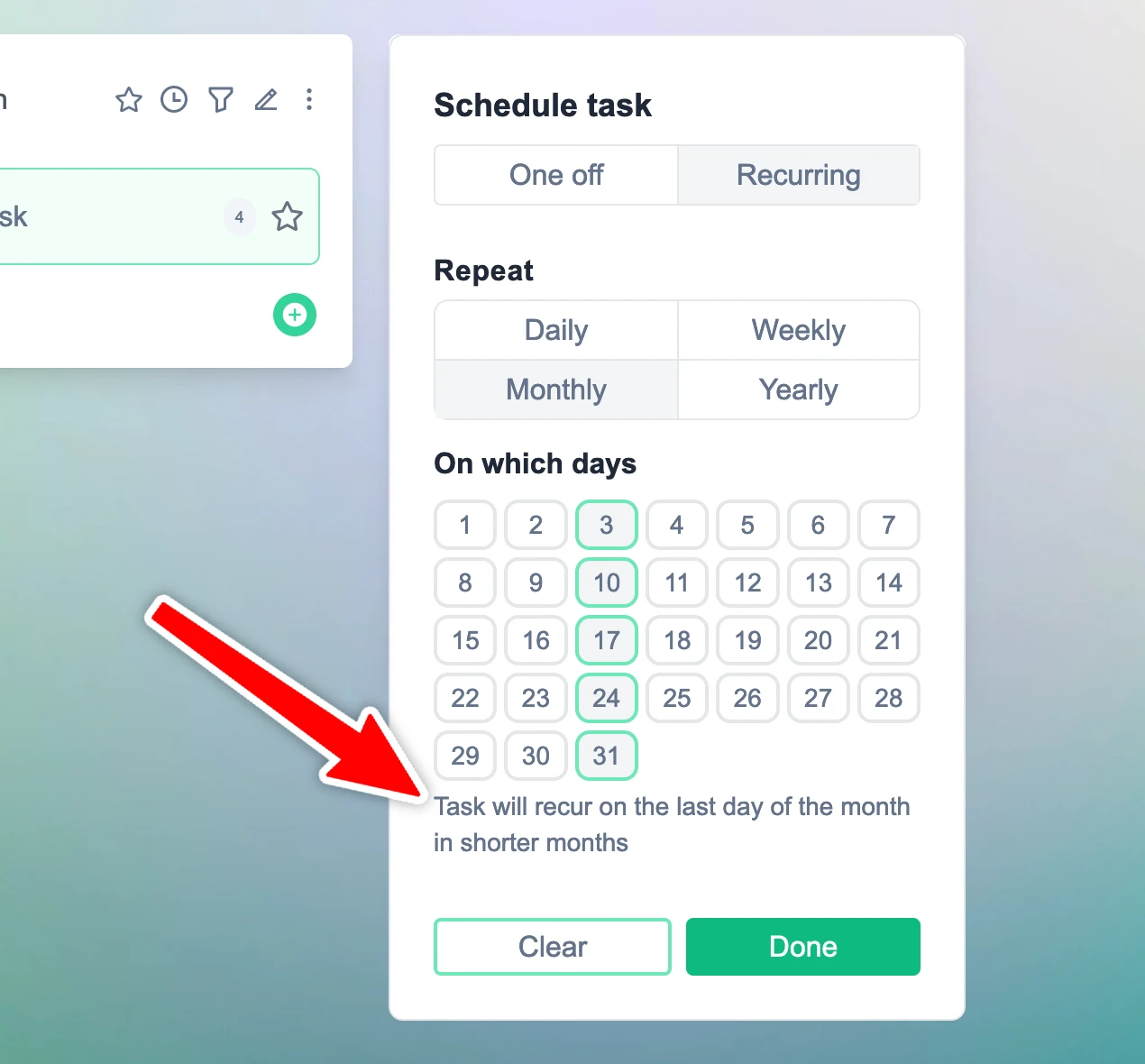 When scheduling a recurring task for every month, if the task is set to recur on the 31st of the month and the month only has 30 days, the task will recur on the 30th instead.