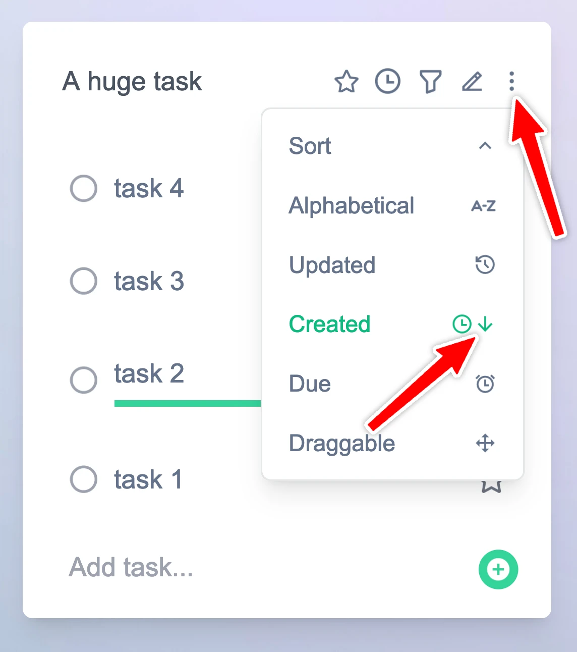 Clicking on a sort option such as 'Created at' will first sort the tasks by creation date, then clicking 'Created at' again will toggle whether they are sorted ascending or descending.